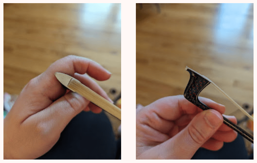 I was a bit underwhelmed when I unwrapped the bow because the tip of the bow is a bit rough and dirty-looking, like it wasn’t cleaned properly after it came out of the mold. A strike against quality check, there. The rest of it looked fine for the price: straight stick, even ribbon of hair, screw adjusts easily.