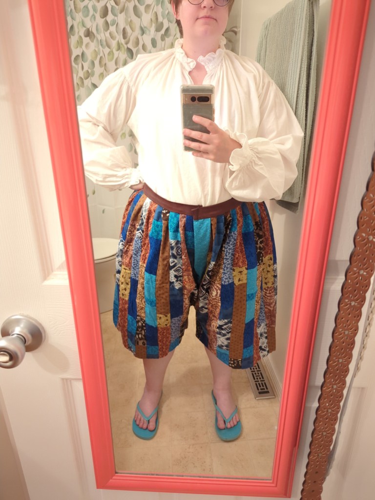 These pants aren’t proper Renaissance-y slops, but a quick knock up of something similar. Well, kind of similar. Not really similar. They are made of rectangular construction (in fact, the base fabric started life as hakama!) whereas real slops or breeches of the Renaissance in Western Europe would have a shaped pattern. The story I’ve had in my head as I work on Rabbit’s costume is that none of the outer garments were made for him, but rather cobbled together from different sources and held together with the ingenuity of a low-budget theater costumer.