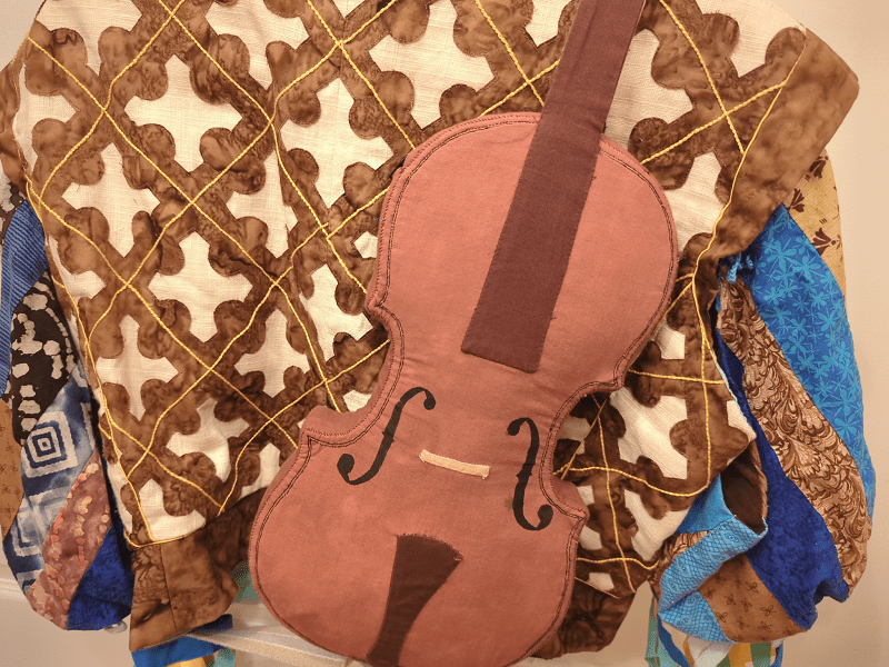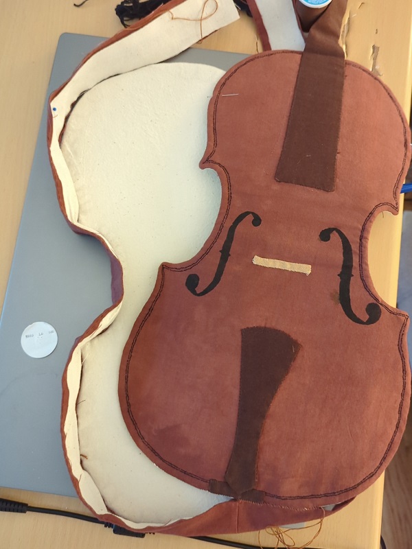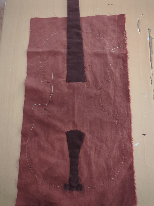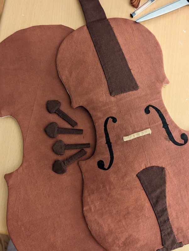 The fabric for the body and scroll is regular old quilting cotton than I dyed using RIT. (It is, in fact, as awful as I remember, but I was really desperate to dye some wool quickly, so I threw in some cotton to soak up the “excess” aka the non-acid component of RIT.) I didn’t have any black cotton to hand that I wanted to sacrifice, so I used dark brown to mimic a rosewood look for the fingerboard and miscellaneous fittings. I made a stencil out of freezer paper for the f-holes. I had a little blow out on the treble f-hole but I just… used some brown fabric paint to cover it up later.