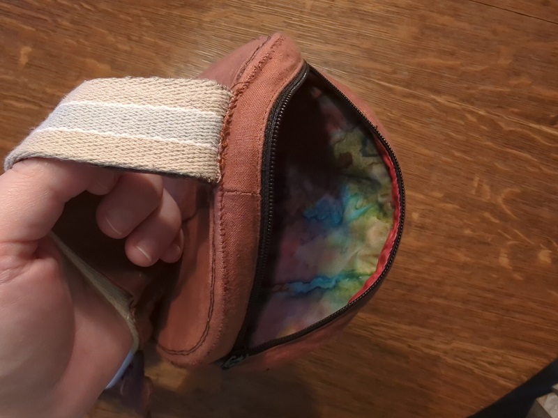 Despite the floppiness from the lack of stiffening, I was so pleased with how the bag turned out. I used an old belt for the strap; the scroll is tacked on to the strap. At the other end, I stitched on the strap and finished it off with a thread button for the end pin.